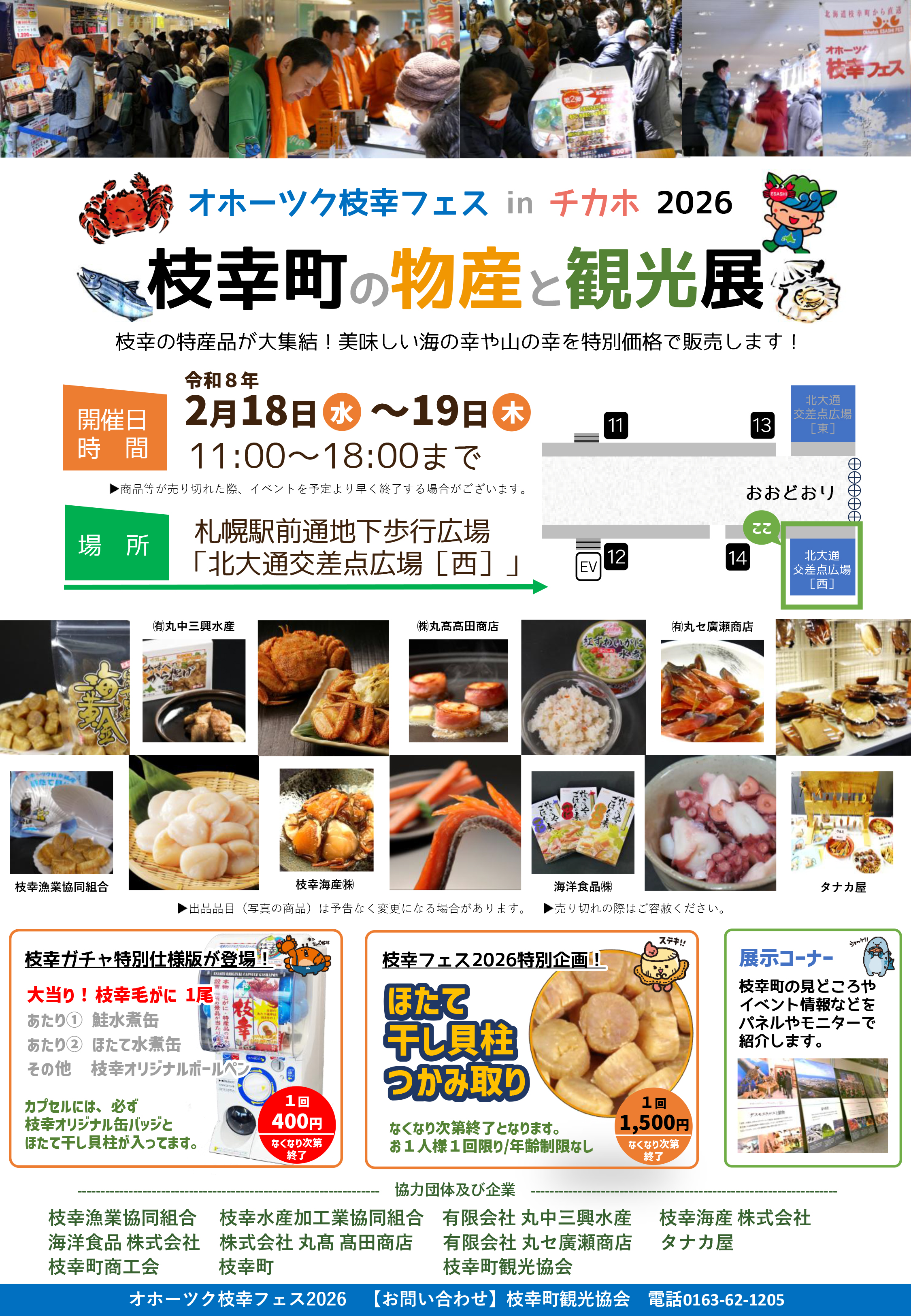毎年人気のオホーツク枝幸フェスは、日本有数の水揚げを誇る「枝幸毛がに」や、「ほたて」、さらには鮭やタコなどの水産加工品が勢揃い、枝幸町の特産品が札幌で購入できる、大変お得なイベントです。